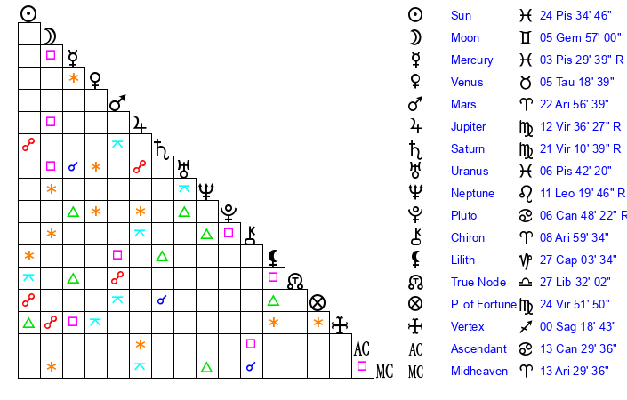 | Sun | 24 Pisces 34 | 25 Pisces 22 | 5 Cancer 28 |