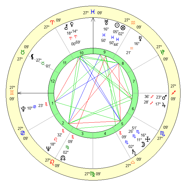 | Sun | 5 Pisces 50 | 7 Pisces 20 | 14 Gemini 43 |