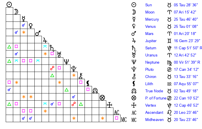 | Uranus | 12 Aries 42 | 26 Taurus 5 | 15 Aries 20 |