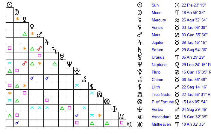 | Mars | 0 Cancer 56 | 18 Cancer 44 | 19 Leo 59 |