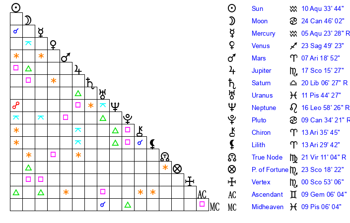 | Moon | 24 Cancer 43 | 7 Pisces 6 | 24 Aries 23 |