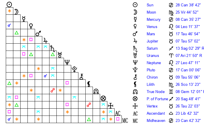 | Sun | 28 Cancer 39 | 29 Cancer 11 | 3 Scorpio 2 |