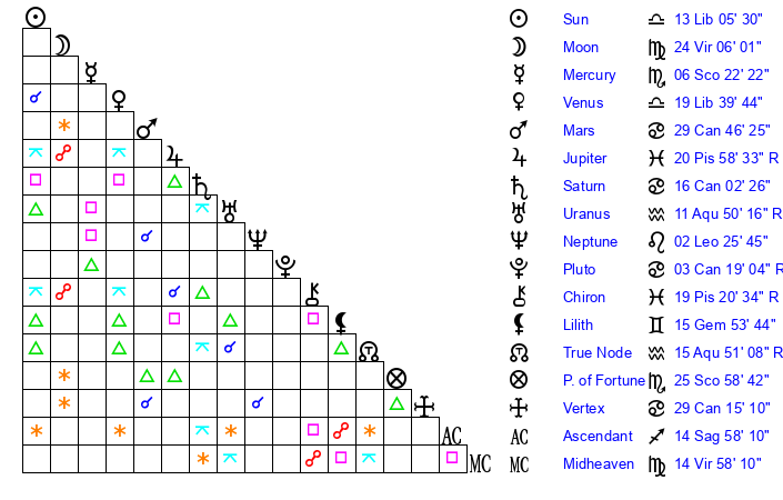 | Moon | 24 Virgo 6 | 18 Aries 30 | 2 Libra 26 |