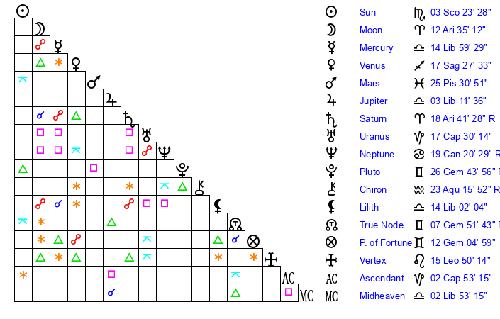 | Mercury | 15 Libra 0 | 20 Scorpio 56 | 3 Aquarius 24 |