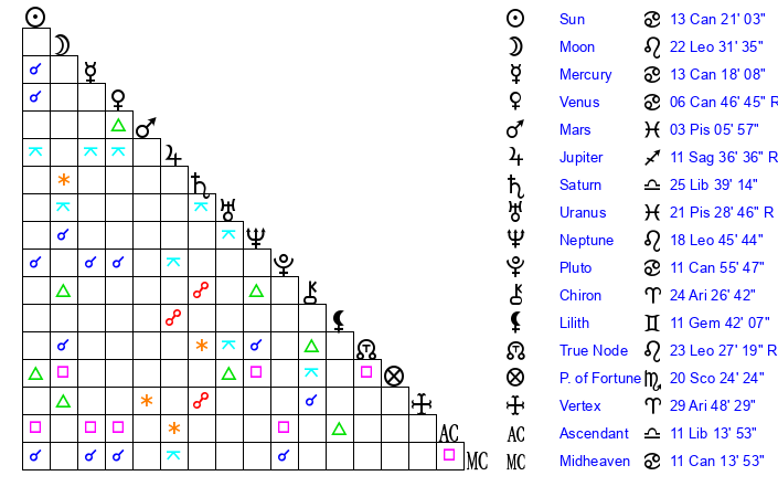 | Moon | 22 Leo 38 | 15 Scorpio 30 | 12 Taurus 31 |