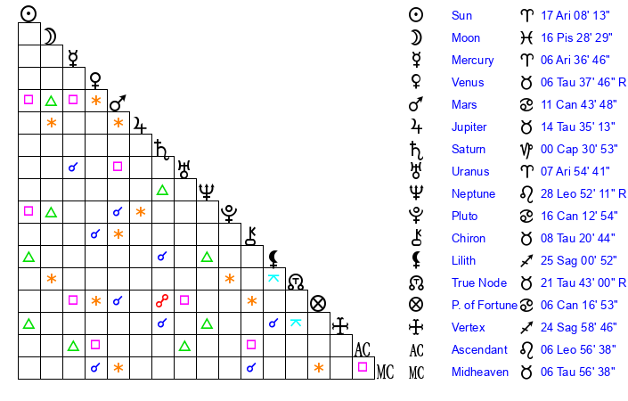 | Venus | 6 Taurus 38 | 25 Pisces 16 | 4 Gemini 27 |