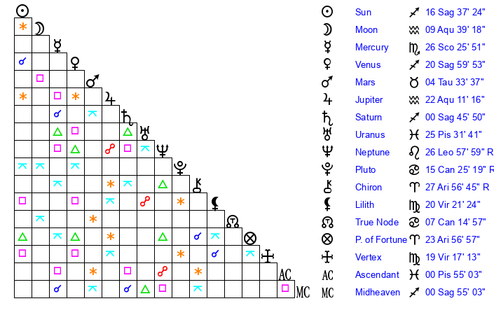 | Sun | 16 Sagittarius 38 | 17 Sagittarius 52 | 25 Pisces 52 |