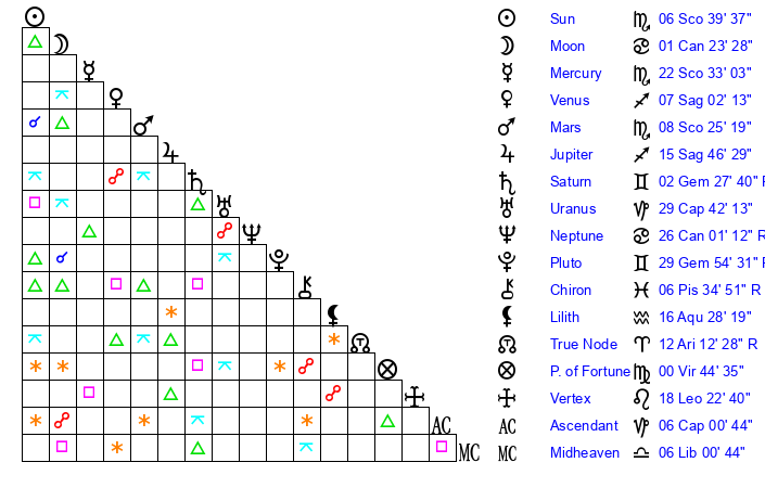 Sun | 6 Scorpio 40 | 7 Scorpio 31 | 0 Pisces 13 |