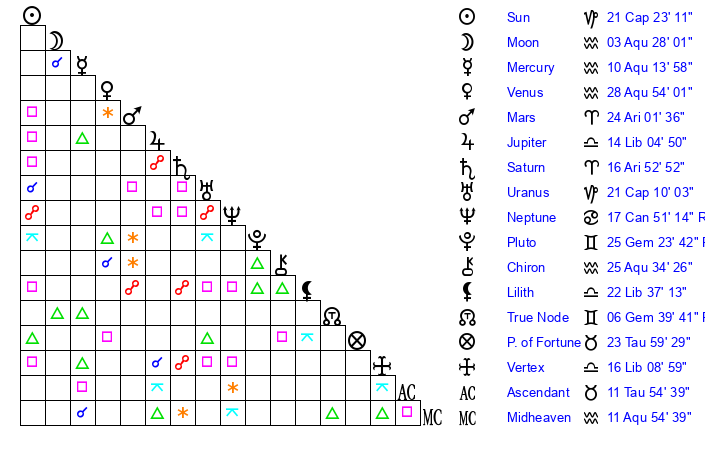 | Moon | 3 Aquarius 28 | 3 Cancer 51 | 20 Aries 53 |