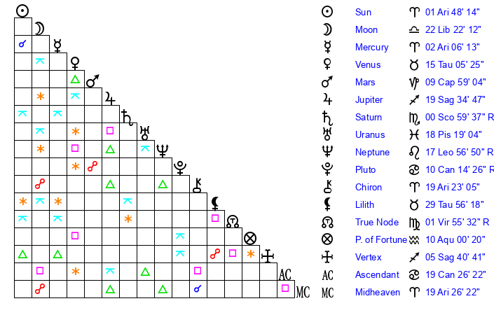 | Sun | 1 Aries 48 | 2 Aries 19 | 9 Cancer 32 |