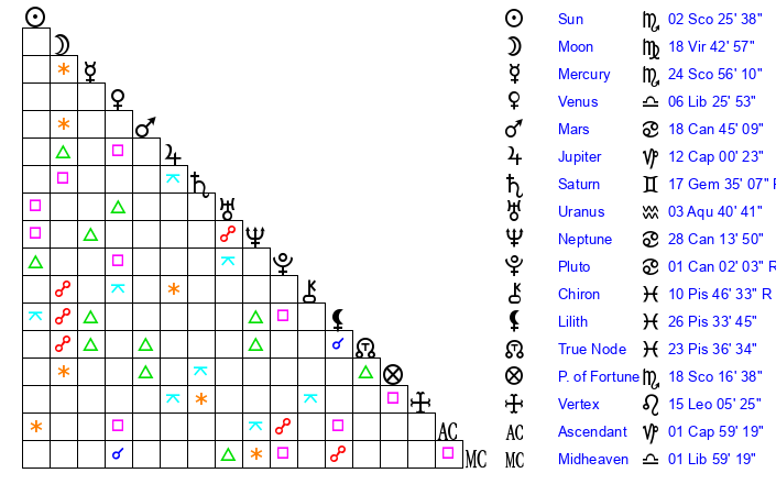 | Mercury | 24 Scorpio 56 | 26 Scorpio 45 | 11 Pisces 30 |