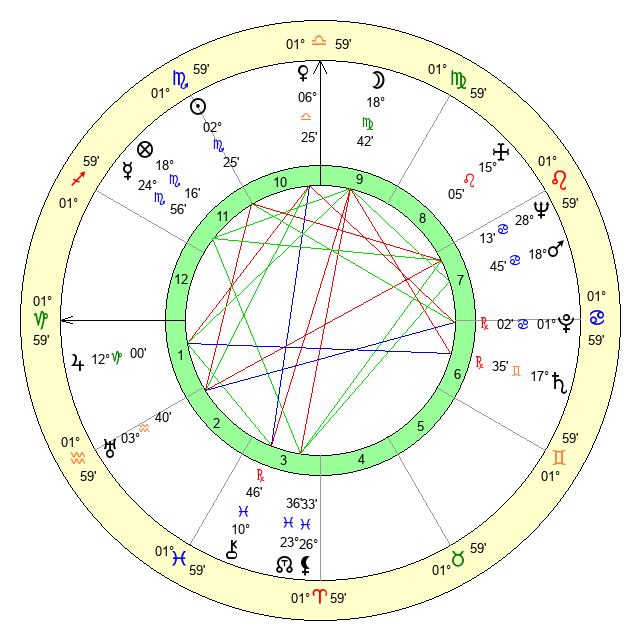 | Moon | 18 Virgo 47 | 27 Sagittarius 7 | 0 Scorpio 31 |