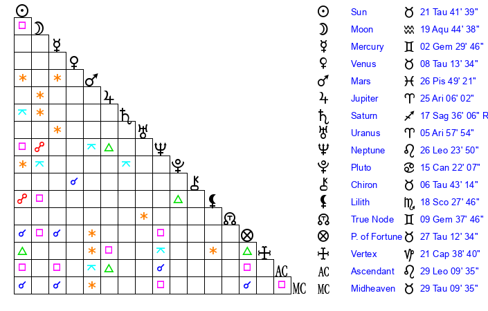 | Moon | 19 Aquarius 34 | 22 Scorpio 14 | 20 Virgo 58 |