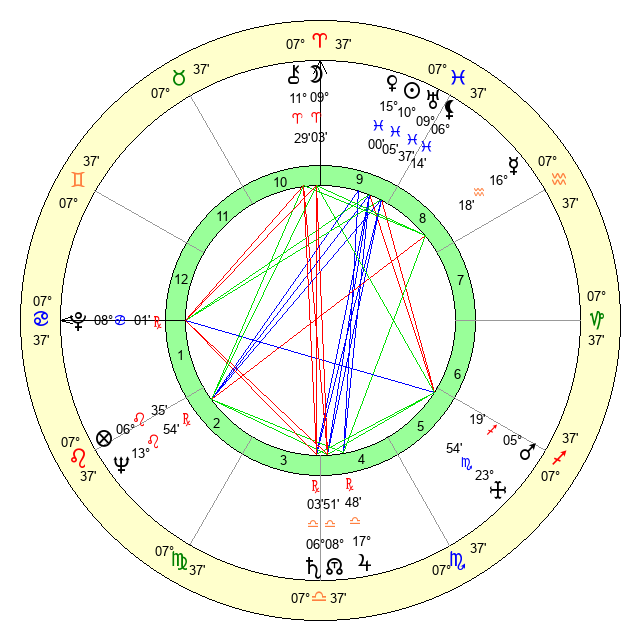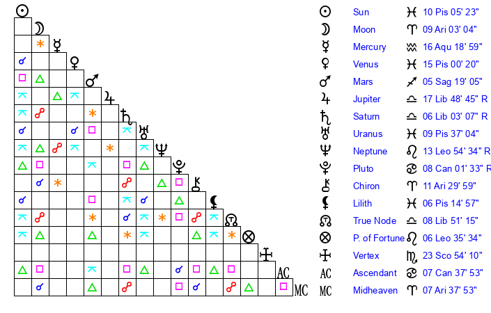 | Sun | 10 Pisces 5 | 11 Pisces 6 | 20 Gemini 41 |