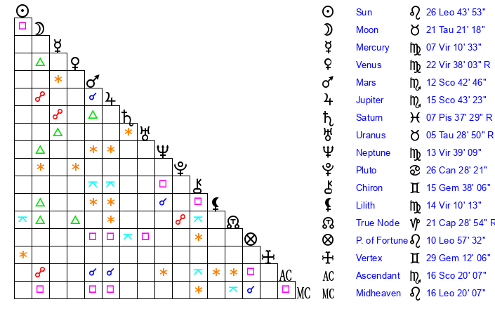 | Moon | 21 Taurus 22 | 26 Cancer 17 | 2 Virgo 54 |