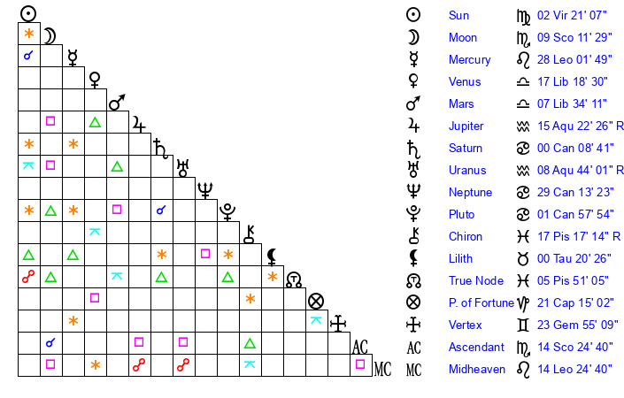 | Mercury | 28 Leo 2 | 17 Leo 18 | 10 Sagittarius 58 |