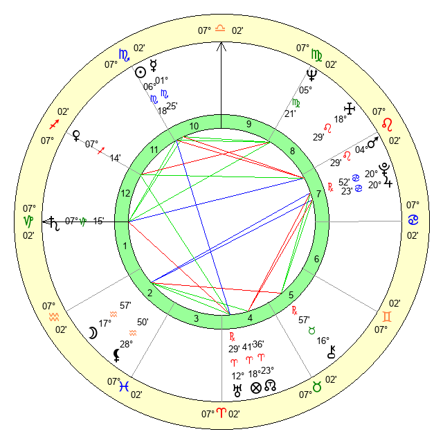 | Neptune | 5 Virgo 22 | 29 Pisces 48 | 5 Virgo 0 |