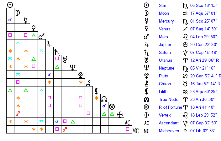 | Sun | 6 Scorpio 18 | 7 Scorpio 16 | 12 Aquarius 39 |