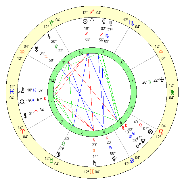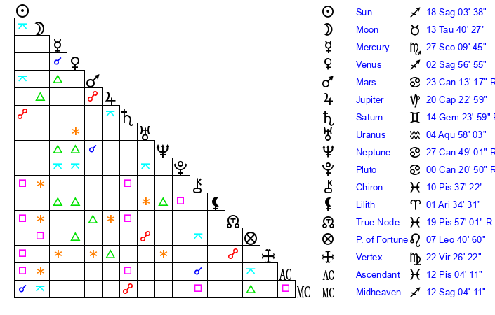 | Venus | 2 Sagittarius 57 | 12 Sagittarius 25 | 23 Aries 13 |
