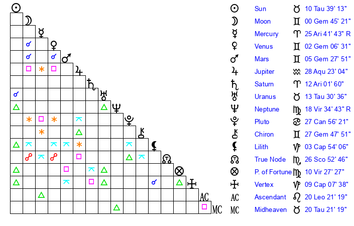 | Jupiter | 28 Aquarius 19 | 21 Gemini 31 | 0 Pisces 10 |