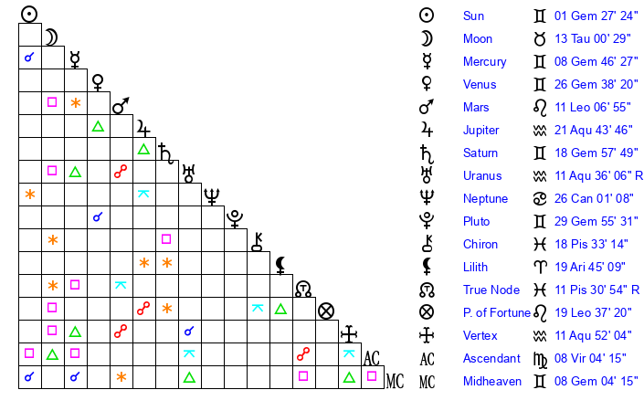 | Moon | 13 Taurus 0 | 11 Aries 11 | 3 Gemini 29 |