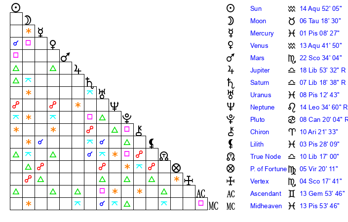| Moon | 6 Taurus 15 | 4 Taurus 22 | 23 Aquarius 23 |