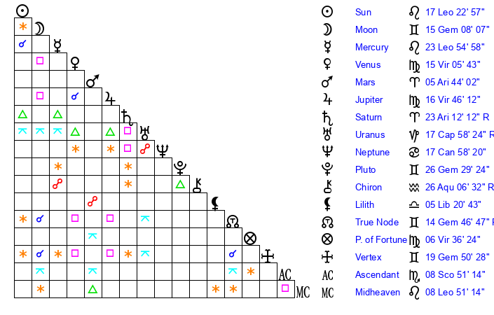 | Sun | 17 Leo 23 | 18 Leo 19 | 11 Sagittarius 56 |