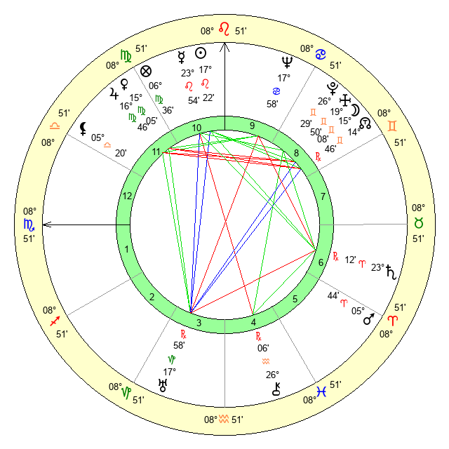 | Mercury | 23 Leo 56 | 4 Leo 16 | 12 Sagittarius 44 |