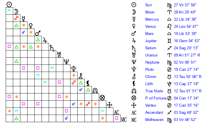 | Moon | 28 Aries 26 | 24 Virgo 21 | 13 Scorpio 56 |