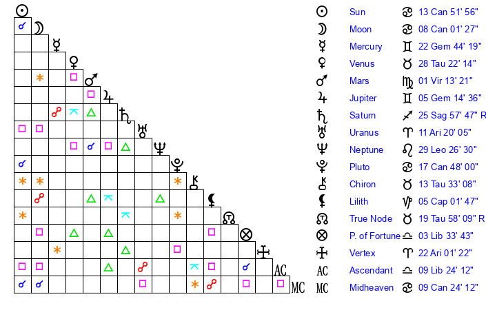 | Mercury | 22 Gemini 44 | 10 Leo 25 | 11 Libra 59 |