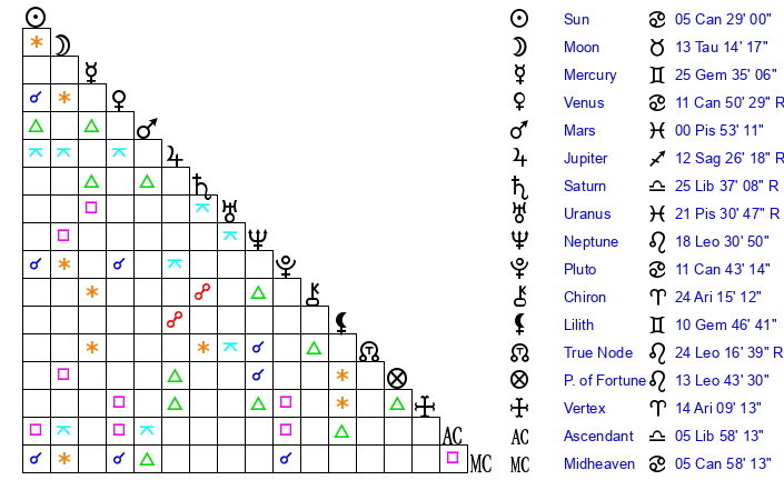 | Pluto | 11 Cancer 43 | 3 Aquarius 12 | 13 Cancer 32 |