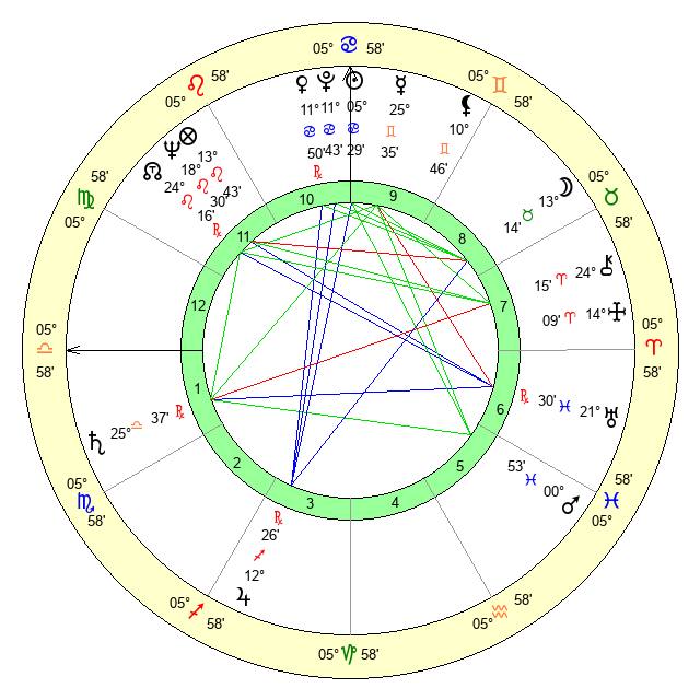| Sun | 5 Cancer 29 | 6 Cancer 3 | 12 Libra 55 |