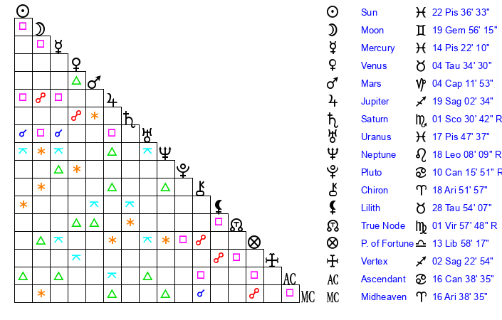 | Neptune | 18 Leo 7 | 29 Pisces 21 | 18 Leo 22 |