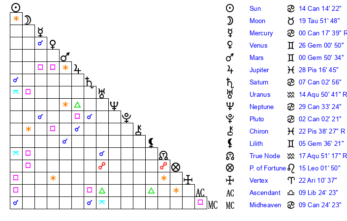 | Neptune | 29 Cancer 34 | 2 Aries 10 | 2 Leo 39 |