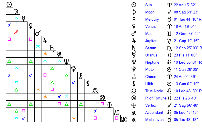 | Sun | 22 Aries 16 | 23 Aries 2 | 28 Cancer 23 |
