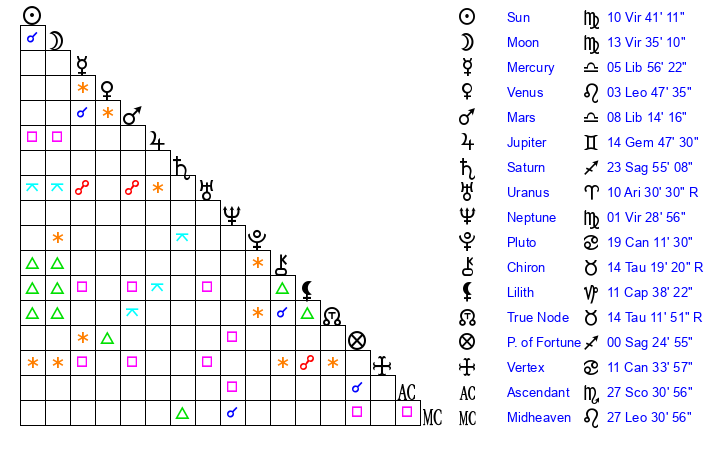 | Moon | 13 Virgo 32 | 20 Capricorn 30 | 8 Pisces 21 |
