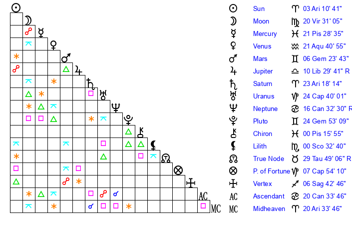 | Moon | 20 Virgo 25 | 0 Aquarius 46 | 0 Sagittarius 49 |