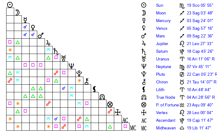 | Sun | 19 Scorpio 6 | 20 Scorpio 18 | 24 Aquarius 33 |