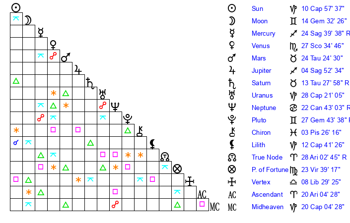 Sun | 10 Capricorn 57 | 12 Capricorn 33 | 4 Taurus 8 |