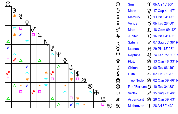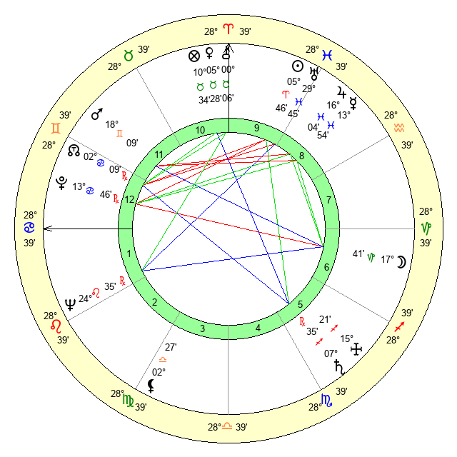 | Pluto | 13 Cancer 47 | 3 Aquarius 28 | 15 Cancer 20 |