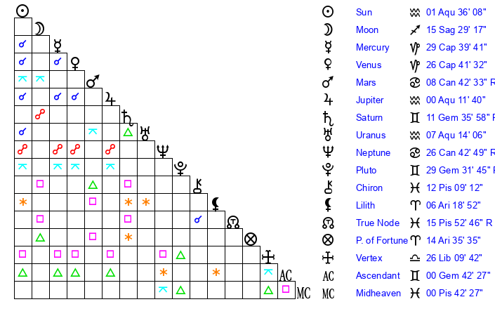 | Pluto | 29 Gemini 31 | 1 Aquarius 44 | 29 Gemini 43 |