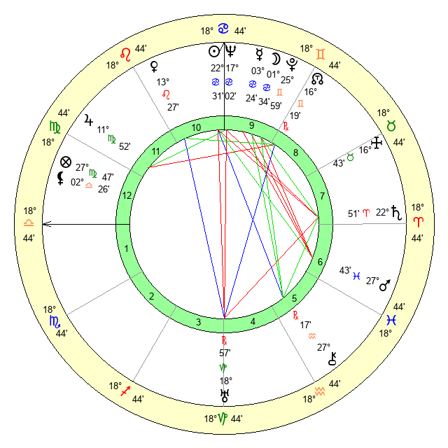 | Moon | 1 Cancer 25 | 23 Pisces 19 | 27 Virgo 54 |