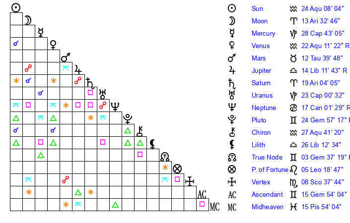 | Sun | 24 Aquarius 8 | 25 Aquarius 15 | 17 Gemini 0 |