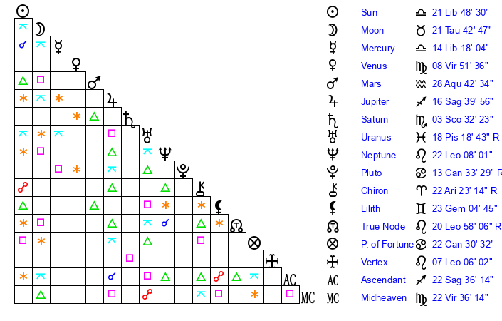 | Sun | 21 Libra 49 | 22 Libra 21 | 3 Aquarius 58 |