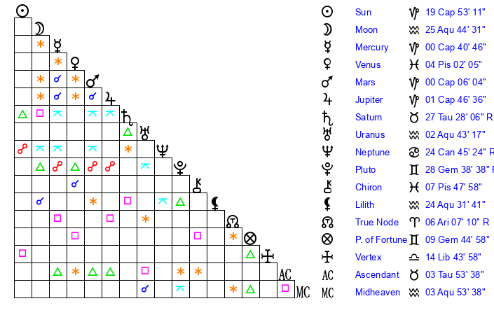 Moon | 25 Aquarius 46 | 9 Gemini 27 | 0 Aries 7 |