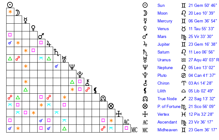 | Sun | 21 Gemini 50 | 22 Gemini 56 | 4 Libra 44 |