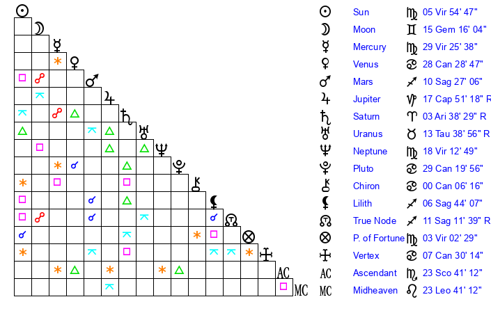 | Sun | 5 Virgo 54 | 6 Virgo 36 | 3 Sagittarius 1 |