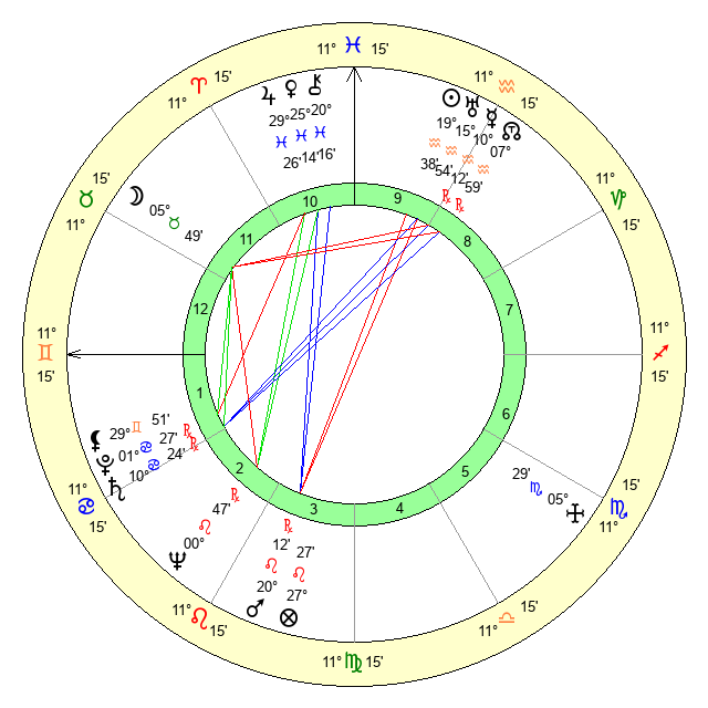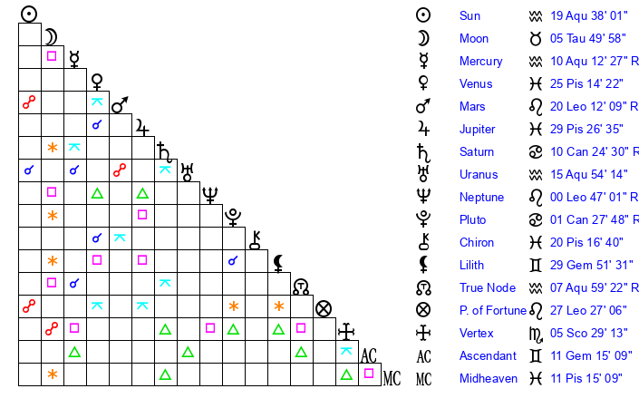 | Sun | 19 Aquarius 38 | 21 Aquarius 12 | 6 Gemini 59 |