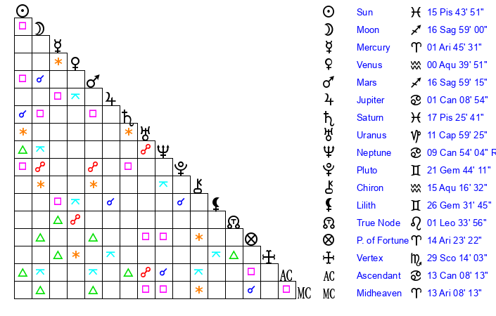 | Sun | 15 Pisces 44 | 17 Pisces 7 | 10 Cancer 21 |