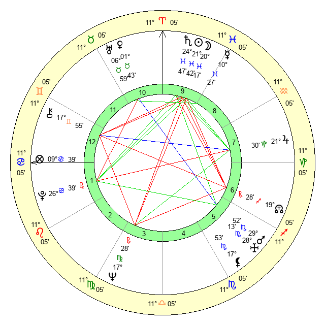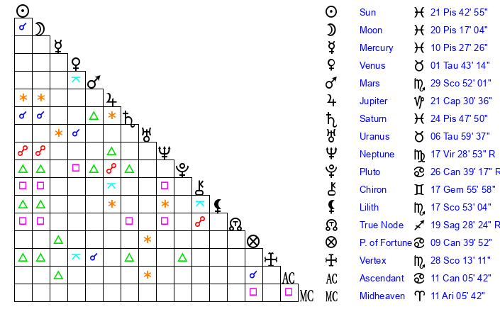 | Sun | 21 Pisces 42 | 22 Pisces 22 | 17 Gemini 27 |